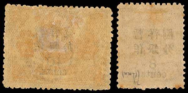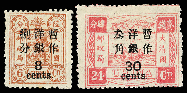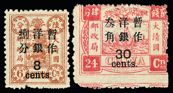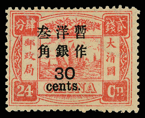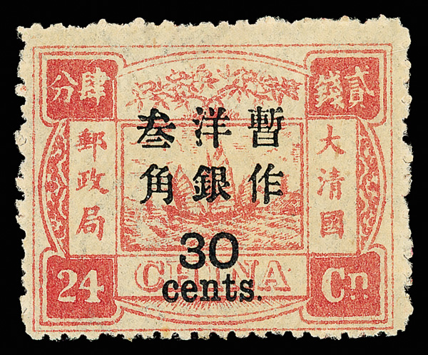 100 ng image1897, Large Figures wide surcharge on Dowager, 1st printing, 30¢ on 24ca carmine (Chan 55. Scott 46), fresh with good color, without gum, Fine to Very Fine. Scott $1,750 (HK$ 13,460). (Image1) (Image2) (All Images)
