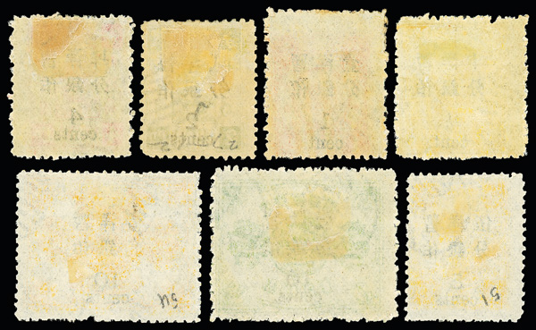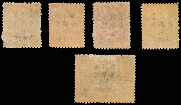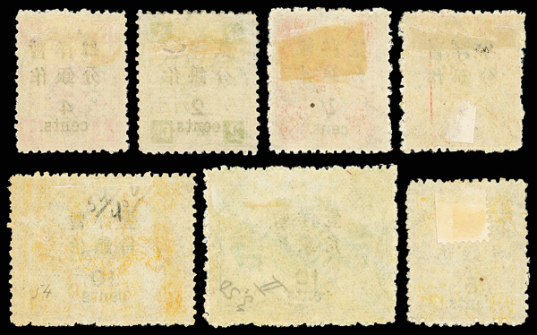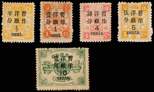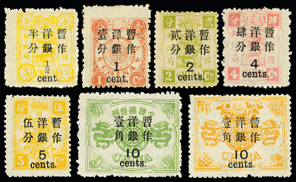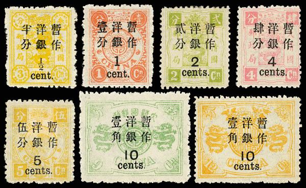 105 og image1897, Large Figures narrow surcharge on Dowager, 1st printing, ½¢ on 3ca orange yellow//10¢ on 12ca brown orange (Chan 65-66, 68-72. Scott 56-57, 59-63), pretty group of seven comprising ½c on 3ca, 1c on 1ca, and 4c on 4ca to 10c on 12ca, fresh and attractive with strong colors and solid centering, o.g., lightly hinged, generally Very Fine, a nice quality group. Scott $5,090 (HK$ 39,150). (Image1) (Image2) (Image3) (Image4) (All Images)