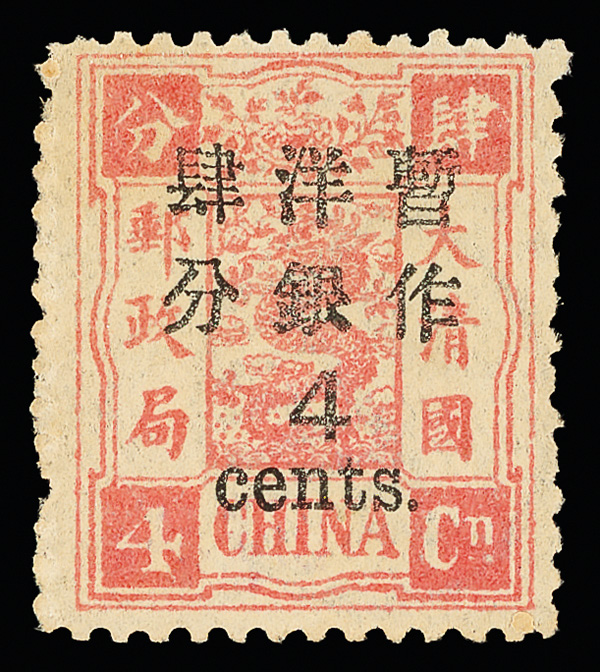 110 og image1897, Large Figures narrow surcharge on Dowager, 1st printing, 4¢ on 4ca rose pink (Chan 68. Scott 59), bright and clean with clear margins all around, o.g., very lightly hinged, Very Fine, signed L.F.L. & another. Scott $290 (HK$ 2,230). (Image1) (Image2) (All Images)