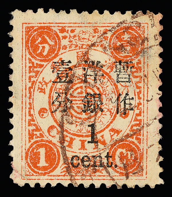 108 O image1897, Large Figures narrow surcharge on Dowager, 1st printing, 1¢ on 1ca vermilion (Chan 66. Scott 57), with lovely color and centering, sound, with Large Dollar Dater cancel, Very Fine. Scott $290 (HK$ 2,230). (Image1) (Image2) (All Images)