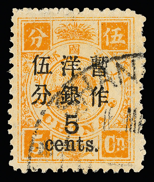 113 O image1897, Large Figures narrow surcharge on Dowager, 1st printing, 5¢ on 5ca dull orange (Chan 69. Scott 60), very nicely centered with rich color and partial Hankow Large Dollar Dater, Very Fine. Scott $290 (HK$ 2,230). (Image1) (Image2) (All Images)
