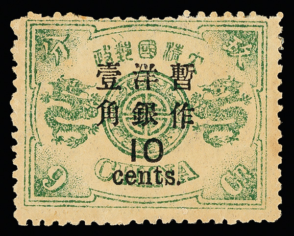 115 og image1897, Large Figures narrow surcharge on Dowager, 1st printing, 10¢ on 9ca dull green (Chan 71. Scott 62), with good color and bold surcharge, centered just to top, o.g., hinged; light, even toning from gum, Fine to Very Fine. Scott $350 (HK$ 2,690). (Image1) (Image2) (All Images)