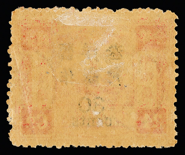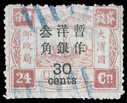 104 O image1897, Large Figures wide surcharge on Dowager, 2nd printing, 30¢ on 24ca deep rose red, "Three" character type A (Chan 64a. Scott 55 var.), with warm color and sharply printed surcharge, all complemented by two partial pakua strikes in blue, Fine. (Image1)