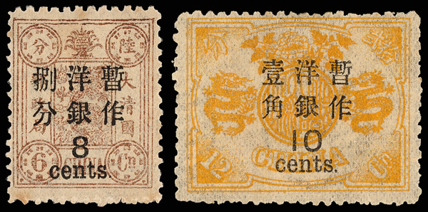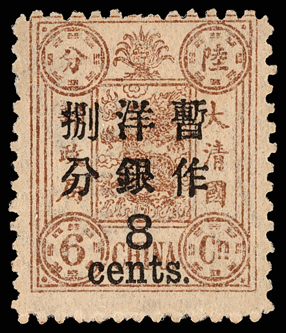 114 og image1897, Large Figures narrow surcharge on Dowager, 1st printing, 8¢ on 6ca chocolate (Chan 70. Scott 61), wonderfully fresh with clean impression and strong surcharge, o.g., hinge remnant, Fine to Very Fine. Scott $1,600 (HK$ 12,310). (Image1) (Image2) (All Images)