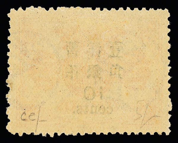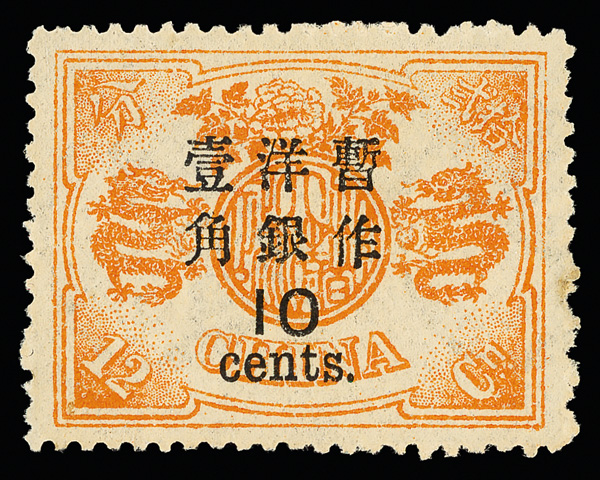 116 og image1897, Large Figures narrow surcharge on Dowager, 1st printing, 10¢ on 12ca brown orange (Chan 72. Scott 63), beautifully centered with rich, vibrant color, o.g., very lightly hinged; tiny perforation stain at right noted strictly for accuracy, Very Fine. Scott $1,600 (HK$ 12,310). (Image1) (Image2) (All Images)