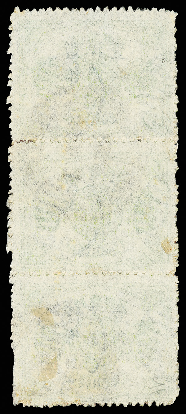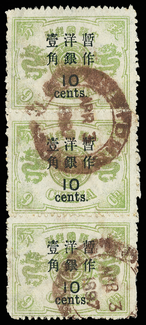 103 O image1897, Large Figures wide surcharge on Dowager, 2nd printing, 10¢ on 9ca yellow green (Chan 62. Scott 53), vertical strip of 3, sound with bright paper and color, cancelled by Shanghai Small Customs dater of Apr. 3, 1897, Fine to Very Fine. Scott $375 as singles (HK$ 2,880). (Image1) (Image2) (All Images)