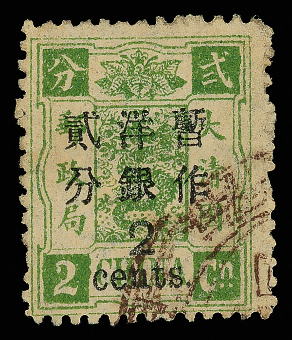 109 O image1897, Large Figures narrow surcharge on Dowager, 1st printing, 2¢ on 2ca green (Chan 67. Scott 58), sound and clean with intense color, clean impression and unobtrusive corner cancel, Fine to Very Fine+, a lovely premium-quality example of this rare issue. Scott $6,000 (HK$ 46,150). (Image1) (Image2) (All Images)