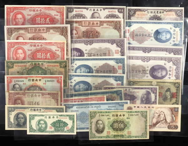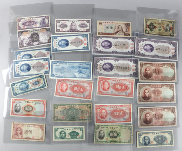 1078 imageChina, Collection of Bank Notes, 1928-80, mostly Republic; includes the following: (1) Pick #459a 1935 10 Yuan AU (3) Pick #332 1930 500 Customs Gold Units AU (3) Pick #329 1930 50 Customs Gold Units AU-UNC (3) Pick #256 1944 100 Yuan XF-AU (3) Pick #240a 1941 20 Yuan VF (1) Pick #195c 1928 1 Dollar Poor, Bank Of Taiwan Pick #1967 1954 10 Yuan VF, Pick #216a 1936 1 Yuan XF, Pick #235 1941 5 Yuan Poor, Pick #270 1945 10 Yuan AU, Pick #217r 1936 5 Yuan Poor, Pick #298 1945 1000 Yuan AU, Pick #403 1948 50 Yuan VF, Pick #290 1945 100 Yuan VF, Pick #886 1980 5 Yuan XF, plus (2) bonus notes; please inspect condition (25). Shipping charges apply - weight 0.8 lbs. (Video for this lot) (Image1) (Image2) (All Images)