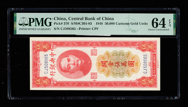 1099 imageChina, 1948 50,000 Customs Gold Units, Central Bank Of China, S/M#C301-83, PMG 64 Choice Uncirculated EPQ (Pick-370) (Image1) (Image2) (All Images)