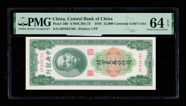1098 imageChina, 1948 25,000 Customs Gold Units, Central Bank Of China, S/M#C301-72, PMG 64 Choice Uncirculated EPQ (Pick-366) (Image1) (Image2) (All Images)