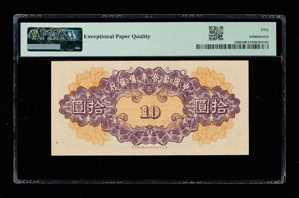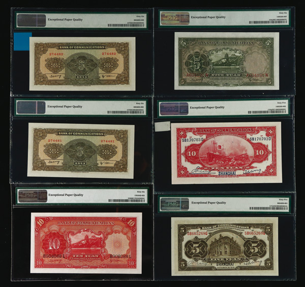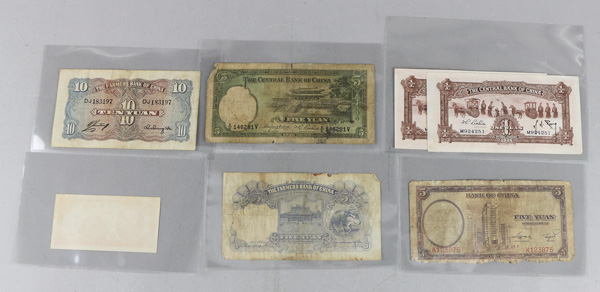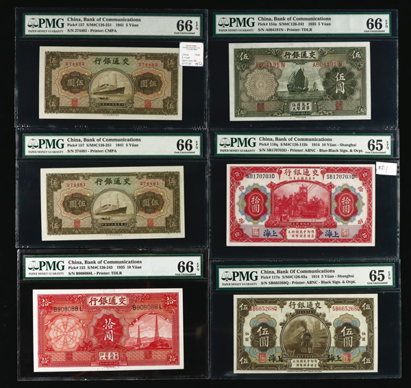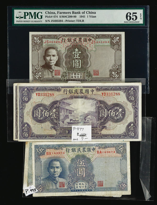 1093 imageGroup of (9) Central Bank Of China, Bank Of China, & Federal Reserve Bank OF China PMG Graded Banknotes, includes: Pick #193a ND (1924) 1 Chiao = 10 Cents PMG 64 Choice Uncirculated (previously mounted); Pick #210 1936 1 Yuan PMG 15 Choice Fine (PVC); Pick #234a 1941 5 Yuan PMG 67 Superb Gem UNC EPQ; Pick #244a 1942 5 Yuan PMG 64 Choice Uncirculated EPQ; Pick #305 1945 5000 Yuan PMG 58 Choice About Unc EPQ; Pick #314 1947 10,000 Yuan PMG 65 Gem Uncirculated EPQ; Pick #85b 1940 10 Yuan PMG 58 Choice About Unc (Great Embossing); Pick #J47b 1939 5 Fen PMG 58 Choice About Unc EPQ; & Pick #J91b ND (1945) 1000 Yuan PMg 50 About Uncirculated (pinhole). (9 notes). (PDF for this Lot) (Image1) (Image2) (All Images)