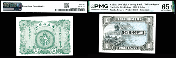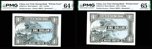 1097 imageGroup of (2), China, 1914 1 Dollar, Lee Yick Cheong Bank "Private Issue", S/M#L4-1r Remainder, PMG Graded 64 & 65 (1) PMG 64 Choice Uncircualted EPQ & (1) PMG 65 Gem Uncirculated EPQ. (PDF for this Lot) (Image1) (Image2) (All Images)