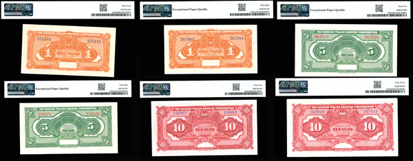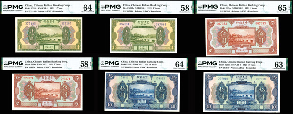 1095 imageGroup of (6) China, Chinese Italian Banking Corp. Remainder Currency PMG Graded, includes: Pick #S253r 1921 1 Yuan PMG 64 Choice Uncircualted; Pick #S253r 1921 1 Yuan PMG 58 Choice About Unc EPQ; Pick #S254r 1921 5 Yuan PMG 65 Gem Uncirculated EPQ; #S254r 1921 5 Yuan PMg 58 Choice About Unc EPQ; Pick #S255r 1921 10 Yuan PMG 64 Choice Uncirculated; Pick #S255r 1921 10 Yuan PMG 63 Choice Uncirculated. (PDF for this Lot) (Image1) (Image2) (All Images)