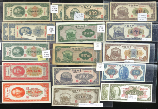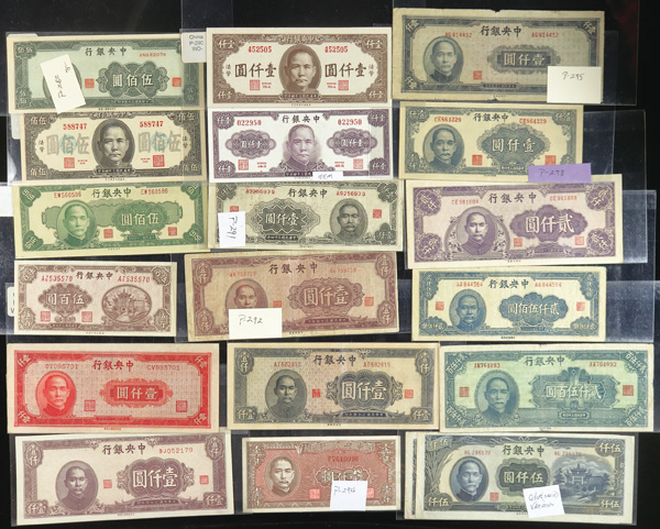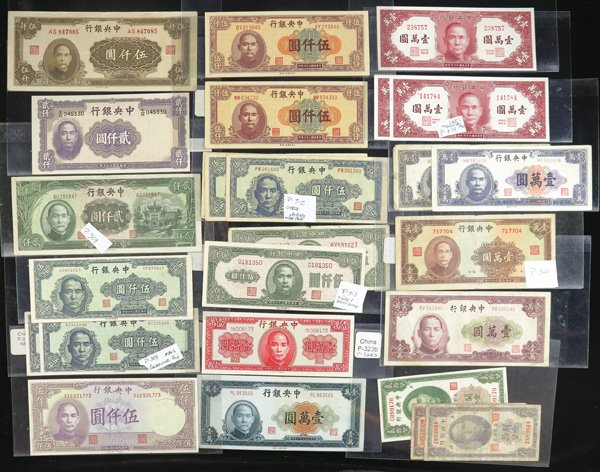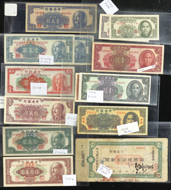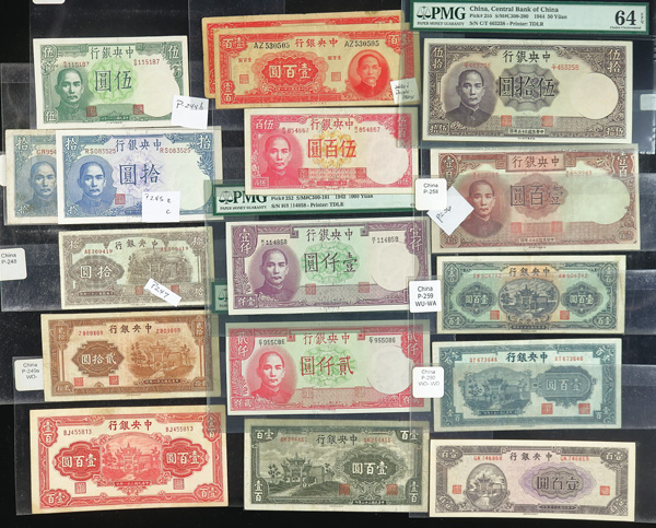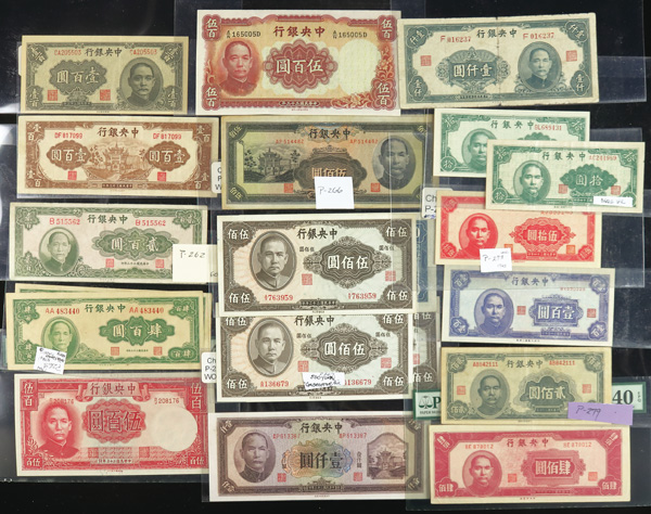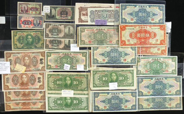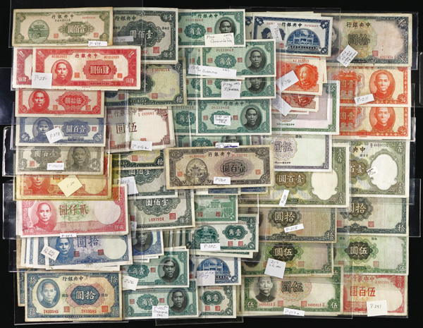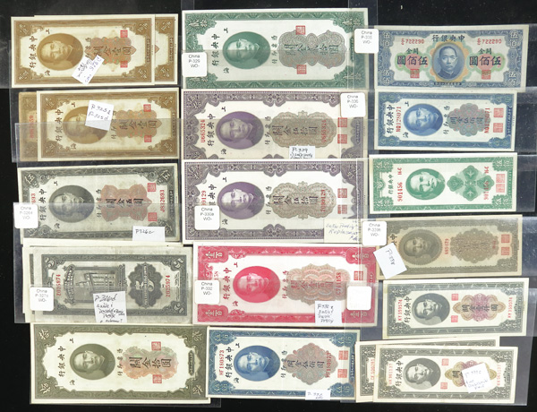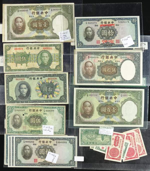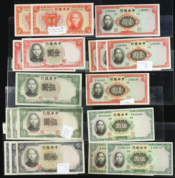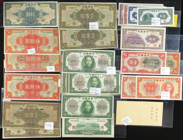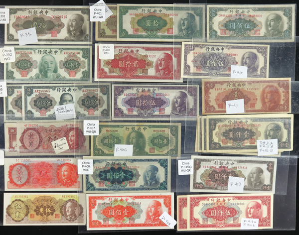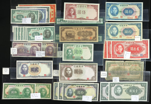 1082 imageChina, Collection Of Central Bank Of China Currency, 1928-1949, highlights include Pick #195c, 204, 205, 211a (3), 212c, 213a, 225a, 228, 234a, 237c, 245c (2), 253, 264, 285, 328, 330a (2), 391, 401 (142) total notes; condition ranges from Poor to Choice Uncirculated; inspection is a must; perfect for any dealer; none submitted for grading; filled with potential. (Video for this lot) (Image1) (Image2) (Image3) (Image4) (All Images)