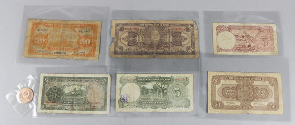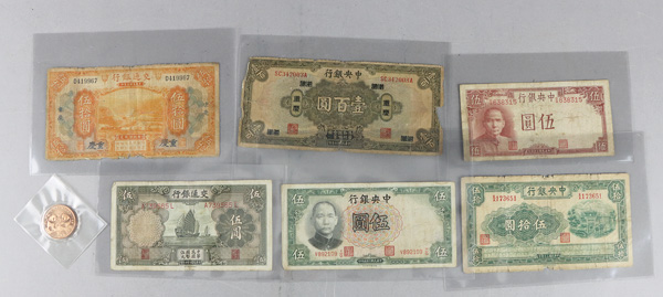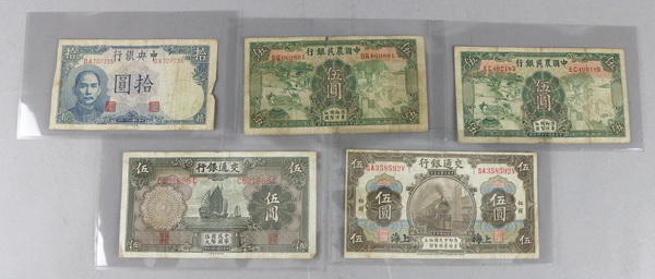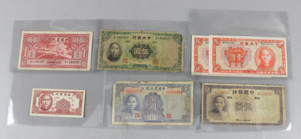 1096 imageChina, Assortment of Currency, 1914-1941, includes the following banknotes: Pick #464 1940 10 Yuan, Pick #242a 1941 50 Yuan (2) Pick #154a 1935 5 Yuan, Pick #235 1941 5 Yuan, Pick #211 1941 10 Yuan, Pick #213a 1936 5 Yuan, Pick #119a 1914 50 Yuan, Pick #199e 1928 100 Yuan, Pick #117a 1914 5 Yuan, Pick #S1452 1949 2 Fen, Pick #80 1937 5 Yuan, Pick #475 1941 5 Yuan (2) Pick #211a 1936 1 Yuan (2) Pick #458 1935 5 Yuan, Pick #217 1936 5 Yuan; condition of notes range from Poor-AU, please inspect; plus a bonus 1993 5 Yuan Copper China Coin (19). Shipping charges apply - weight 0.6 lbs. (Image1) (Image2) (Image3) (Image4) (Image5) (Image6) (Image7) (All Images)