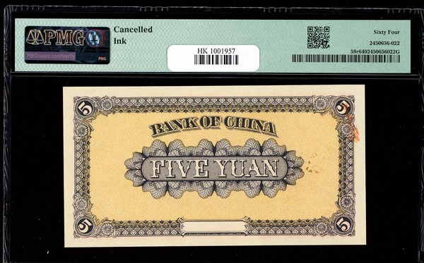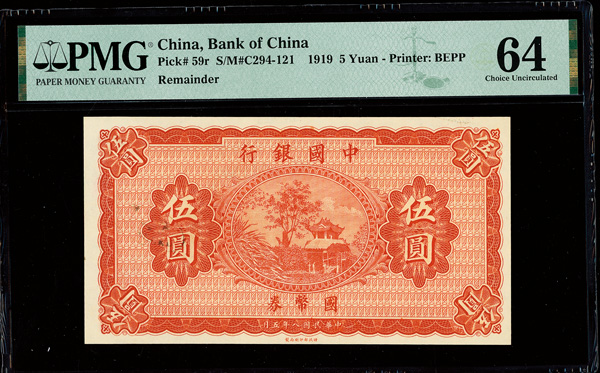 1101 imageChina, 1919 5 Yuan China, Bank Of China, S/M#C294-121 PMG 64 Choice Uncirculated (Pick-59r), cancelled; ink (Image1) (Image2) (All Images)