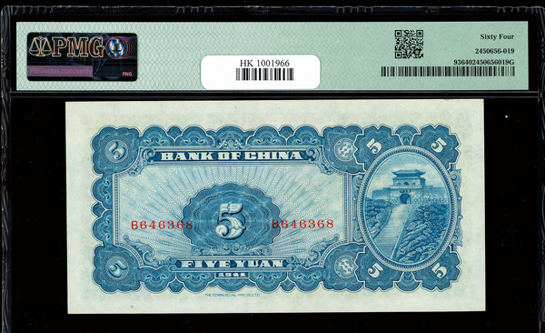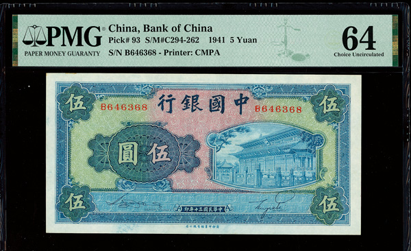 1117 imageChina, 1941 5 Yuan, Bank Of China, S/M#C294-262, PMG 64 Choice Uncirculated (Pick-93) (Image1) (Image2) (All Images)