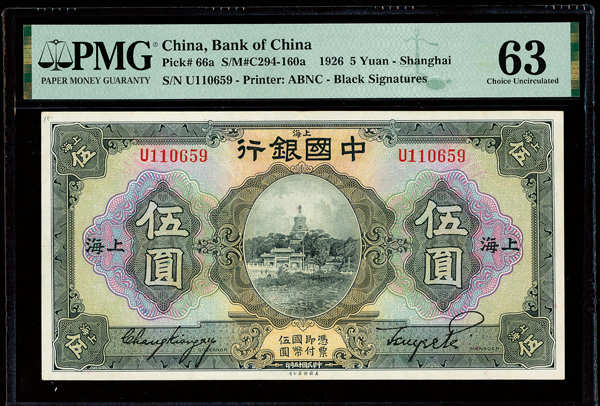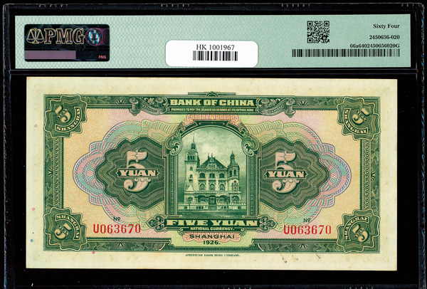 1103 imageChina, 1926 5 Yuan, Bank Of China, S/M#C294-160a, PMG 64 Choice Uncirculated (Pick-66a) (Image1) (Image2) (All Images)