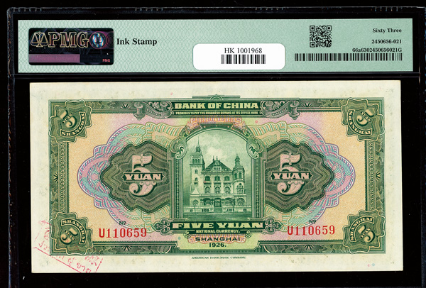 1104 imageChina, 1926 5 Yuan, Bank Of China, S/M#C294-160a, PMG 63 Choice Uncirculated (Pick-66a), Ink stain. (Image1) (Image2) (All Images)