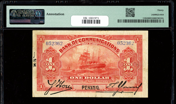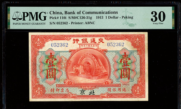 1118 imageChina, 1913 1 Dollar - Peking, Bank Of Communications, S/M#C126-31g PMG 30 Very Fine (Pick-110i), annotations. (Image1) (Image2) (All Images)