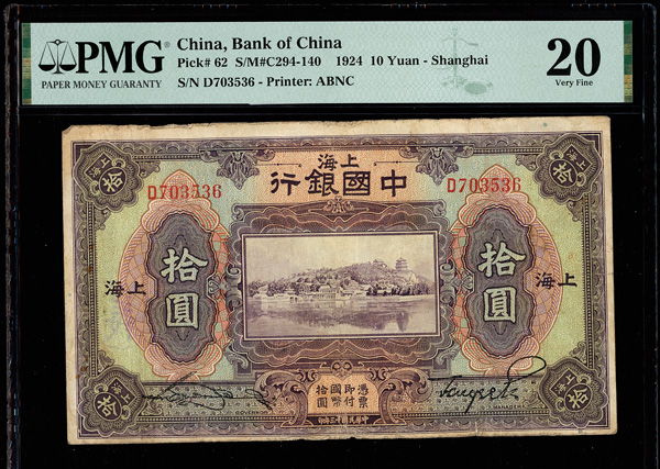 1102 imageChina, 1924 10 Yuan - Shanghai, Bank Of China, S/M#C294-140, PMG 20 Very Fine (Pick-62) (Image1) (Image2) (All Images)