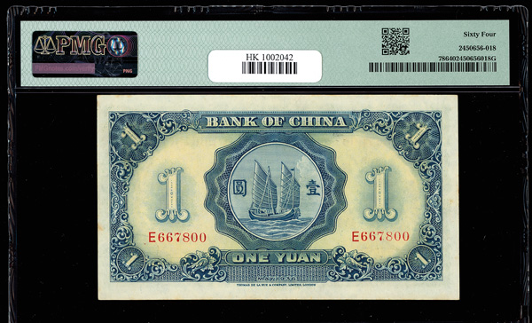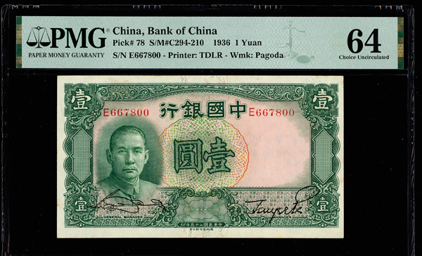 1116 imageChina, 1936 1 Yuan, Bank Of China, S/M#C294-210, PMG 64 Choice Uncirculated (Pick-78) (Image1) (Image2) (All Images)
