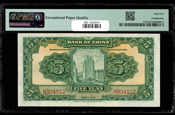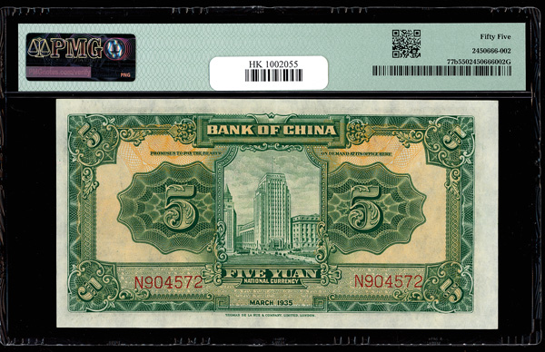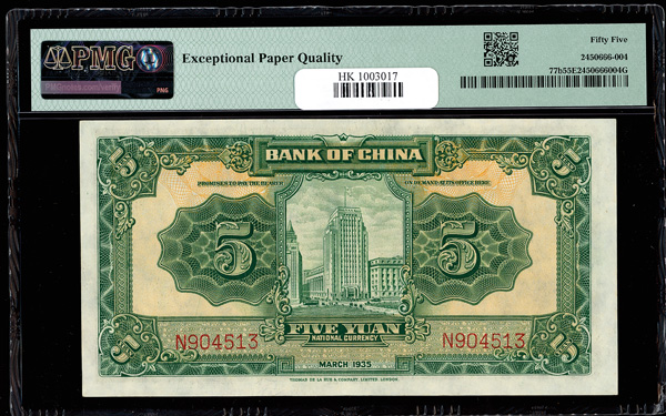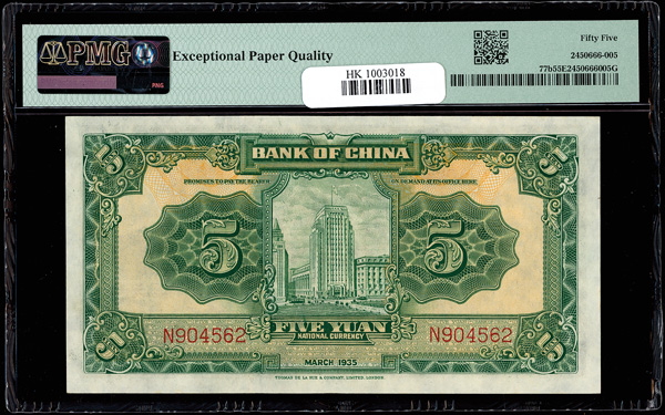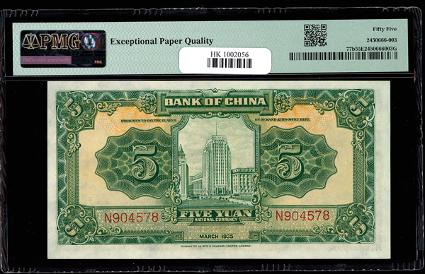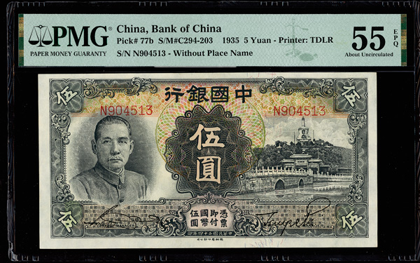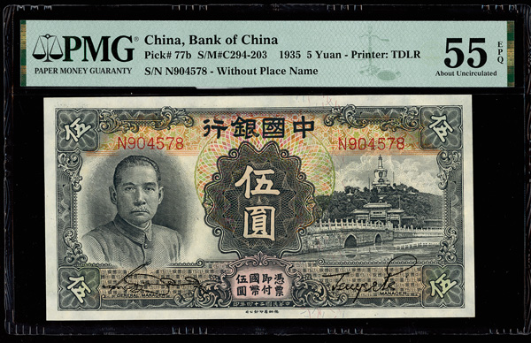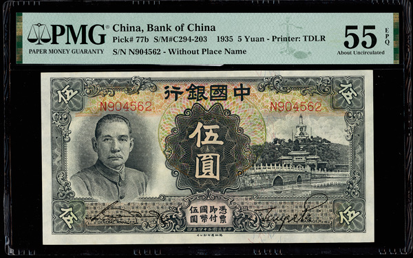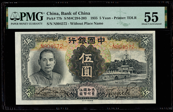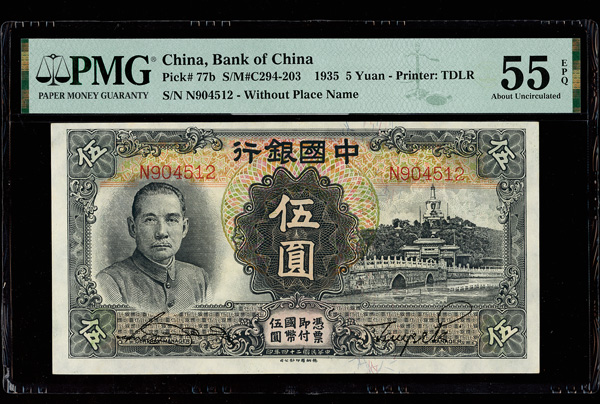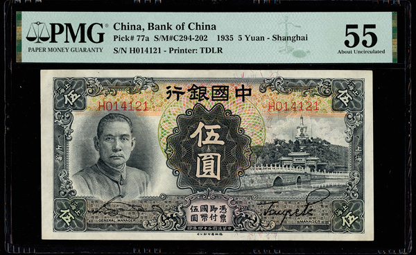 1112 imageChina, 1935 5 Yuan - Printer: TDLR, Bank Of China, S/M#C294-303, PMG 55 About Uncirculated EPQ (Pick-77b) (Image1) (Image2) (All Images)
