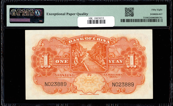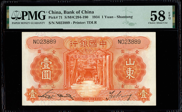 1105 imageChina, 1934 1 Yuan - Shantung, Bank Of China, S/M#C294-190, PMG 58 Choice About Unc EPQ (Pick-71), (Image1) (Image2) (All Images)