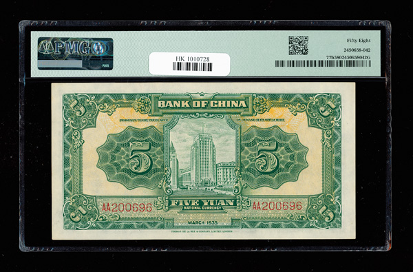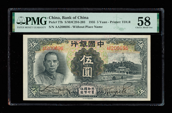 1110 imageChina, 1935 5 Yuan - Printer: TDLR, Bank Of China, S/M#C294-203, PMG 58 Choice About Unc (Pick-77b) (Image1) (Image2) (All Images)