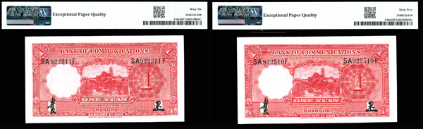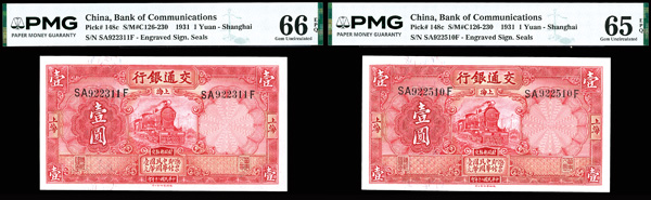 1120 imageGroup of (2) China, 1931 1 Yuan - Shanghai, Bank Of Communications, S/M#C126-230, PMG Graded 66 & 65 Gem Uncirculated EPQ (Pick-148c). (PDF for this Lot) (Image1) (Image2) (All Images)