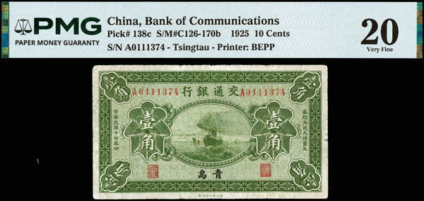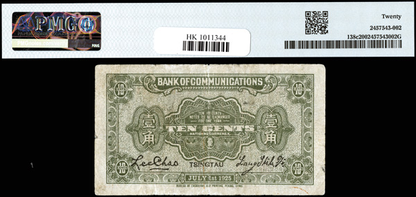 1119 imageChina, 1925 10 Cents, Bank Of Communications, S/M#C126-170b, PMG 20 Very Fine (Pick-138c) (Image1) (Image2) (All Images)
