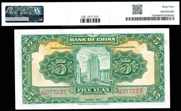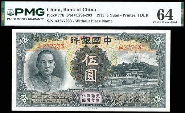 1109 imageChina, 1935 5 Yuan - Printer: TDLR, Bank Of China, S/M#C294-203, PMG 64 Choice Uncirculated (Pick-77b) (Image1) (Image2) (All Images)