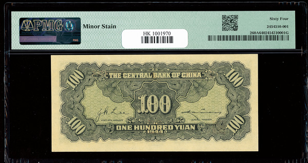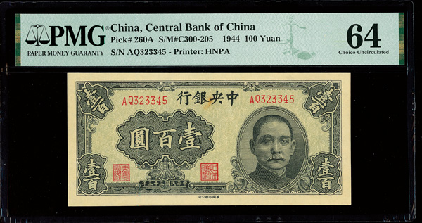 1143 imageChina, 1944 100 Yuan, Central Bank Of China, S/M#C300-205, PMG 64 Choice Uncirculated (Pick-260A), Minor stain. (Image1) (Image2) (All Images)