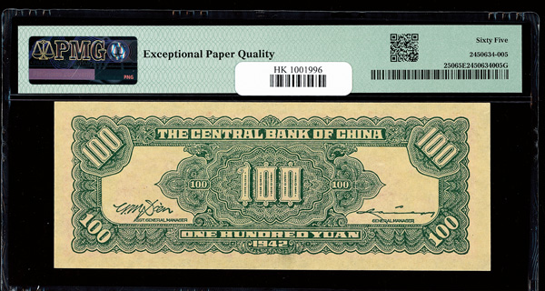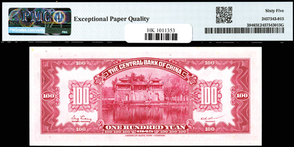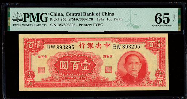 1141 imageChina, 1942 100 Yuan, Central Bank Of China, S/M#C300-176, PMG 65 Gem Uncirculated EPQ (Pick-250) (Image1) (Image2) (All Images)