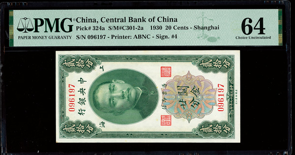 1149 imageChina, 1930 20 Cents - Shanghai, Central Bank Of China, S/M#C301-2a, PMG 64 Choice Uncirculated (Pick-324a) (Image1) (Image2) (All Images)
