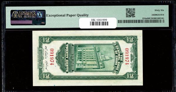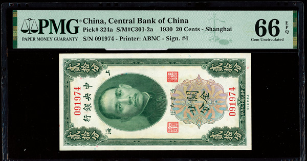 1148 imageChina, 1930 20 Cents - Shanghai, Central Bank Of China, S/M#C301-2a, PMG 66 Gem Uncirculated EPQ (Pick-324a) (Image1) (Image2) (All Images)