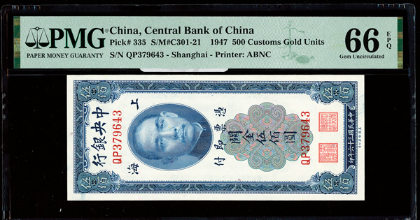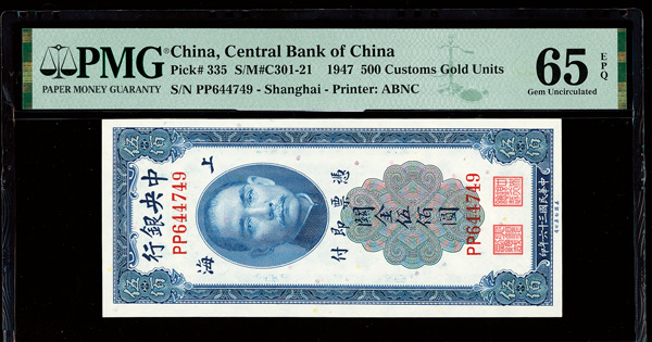 1151 imageChina, 1947 500 Customs Gold Units, Central Bank Of China, S/M#C301-21, PMG 66 Gem Uncirculated EPQ (Pick-335) (Image1) (Image2) (All Images)
