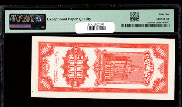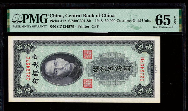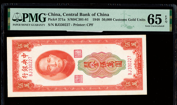 1154 imageChina, 1948 50,000 Customs Gold Units, Central Bank Of China, S/M#C301-81, PMG 65 Gem Uncirculated EPQ (Pick-371a) (Image1) (Image2) (All Images)