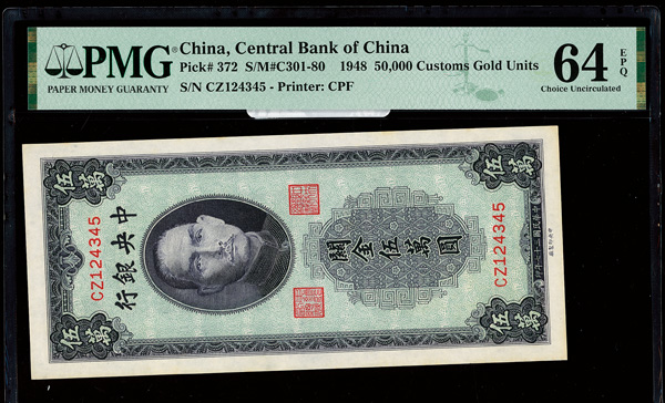 1156 imageChina, 1948 50,000 Customs Gold Units, Central Bank Of China, S/M#C301-80, PMG 64 Choice Uncirculated EPQ (Pick-372) (Image1) (Image2) (All Images)