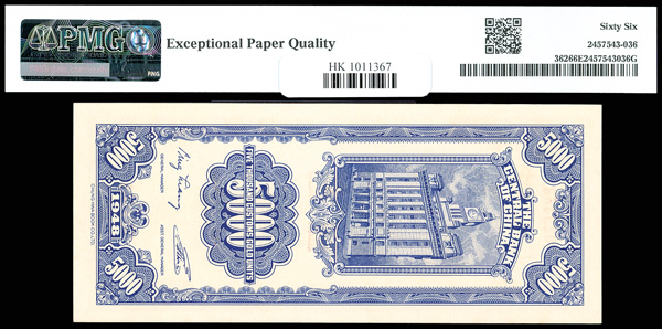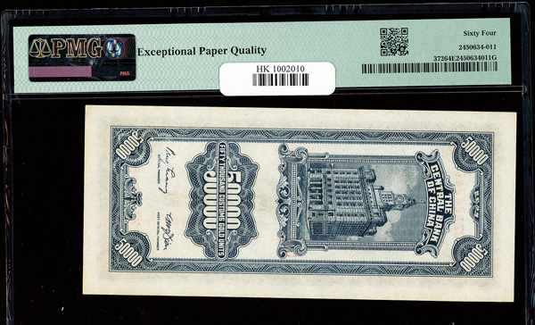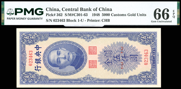 1153 imageChina, 1948 5,000 Customs Gold Units, Central Bank Of China, S/M#C301-63, PMG 66 Gem Uncirculated EPQ (Pick-362) (Image1) (Image2) (All Images)