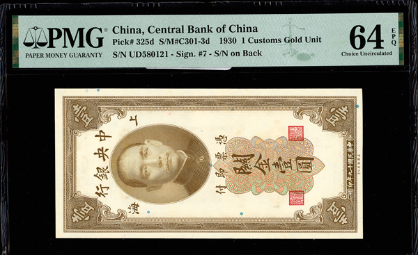1150 imageChina, 1930 1 Customs Gold Unit, Central Bank Of China, S/M#C301-3d, PMG 64 Choice Uncirculated EPQ (Pick-325d) (Image1) (Image2) (All Images)