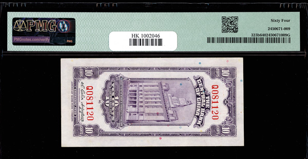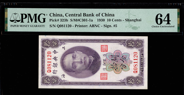 1147 imageChina, 1930 10 Cents - Shanghai, Central Bank Of China, S/M#C301-1a, PMG 64 Choice Uncirculated (Pick-323b) (Image1) (Image2) (All Images)