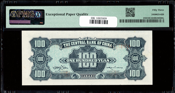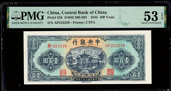 1142 imageChina, 1944 100 Yuan, Central Bank Of China, S/M#C300-204, PMG 53 About Uncirculated EPQ (Pick-258) (Image1) (Image2) (All Images)