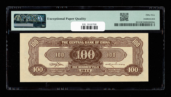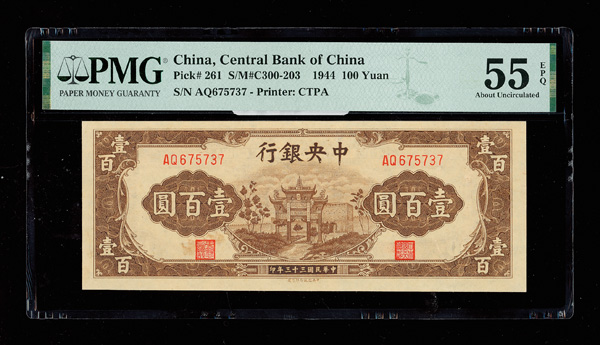 1144 imageChina, 1944 100 Yuan, Central Bank Of China, S/M#C300-203, PMG 55 About Uncirculated EPQ (Pick-261) (Image1) (Image2) (All Images)