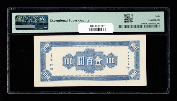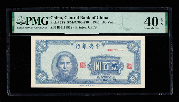 1145 imageChina, 1945 100 Yuan, Central Bank Of China, S/M#C300-230, PMG 40 Extremely Fine EPQ (Pick-278) (Image1) (Image2) (All Images)