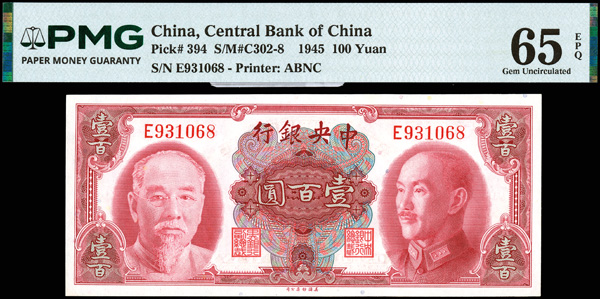 1158 imageChina, 1945 100 Yuan, Central Bank Of China, S/M#C302-8, PMG 65 Gem Uncirculated EPQ (Pick-394) (Image1) (Image2) (All Images)