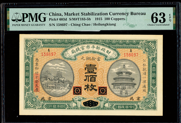 1196 imageChina, 1915 100 Coppers, Market Stablization Currency Bureau, S/M#T183-5h, PMG 63 Choice Uncirculated (Pick-603d) (Image1) (Image2) (All Images)