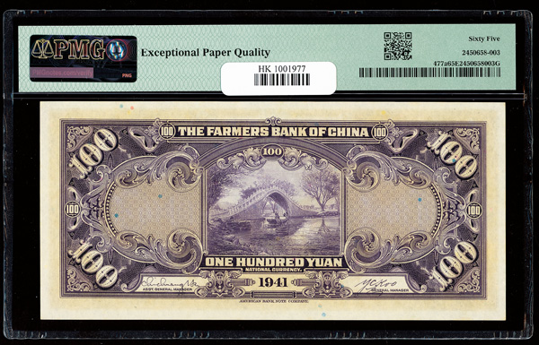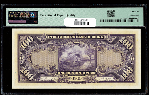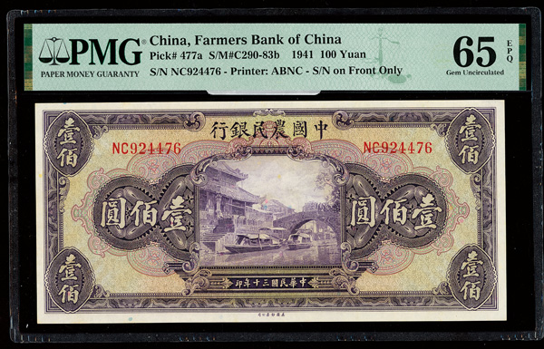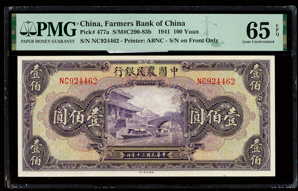 1187 imageChina, 1941 100 Yuan, Farmers Bank Of China, S/M#C290-83b, PMG 65 Gem Uncirculated EPQ (Pick-477a) (Image1) (Image2) (All Images)