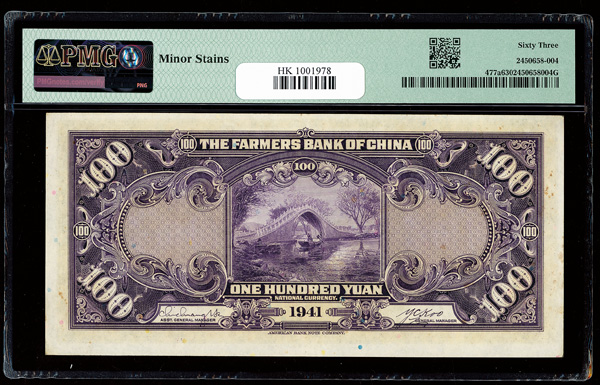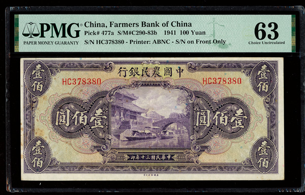 1188 imageChina, 1941 100 Yuan, Farmers Bank Of China, S/M#C290-83b, PMG 63 Choice Uncirculated EPQ (Pick-477a) (Image1) (Image2) (All Images)