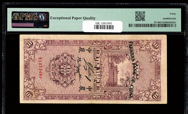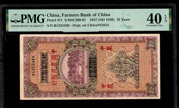1183 imageChina, 1937 (ND 1940) 10 Yuan, Farmers Bank Of China, S/M#C29067, PMG 40 Extremely Fine EPQ (Pick-471). (Image1) (Image2) (All Images)